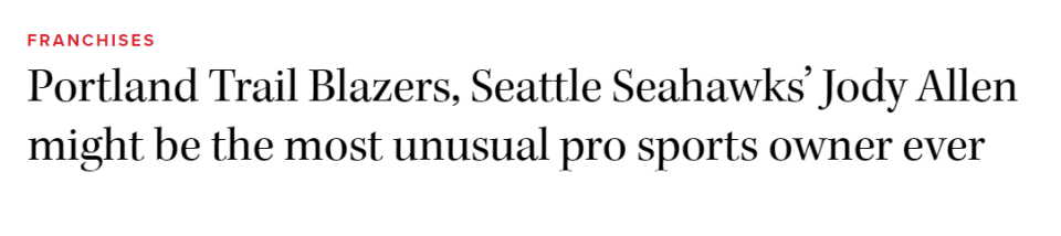 然而,从另一个角度看,朱迪-艾伦根本不算老板。严格来说,她是保罗-艾伦遗产的执行人,也是其资产的唯一受托人。她代表开拓者队参加NBA董事会会议,也代表海鹰队参加NFL的类似会议。根据保罗-艾伦遗嘱的条款,她最终必须出售这两支球队。开拓者出售的一个前提条件是将其留在波特兰。而且,当朱迪-艾伦出售球队后,自己一分钱也拿不到。